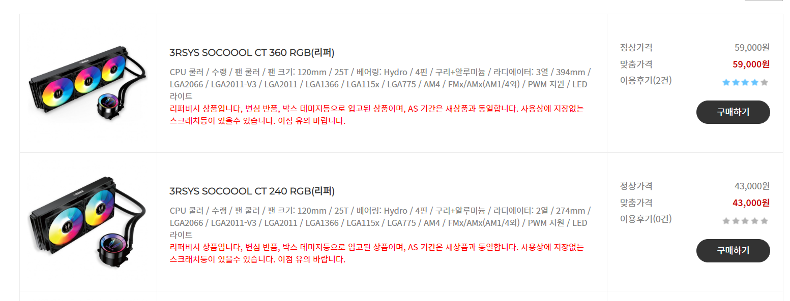 3열 수냉이 6만원이 안됩니다. 2열수냉도 택포 5만원 아래구요. 엄청난 가성비죠.